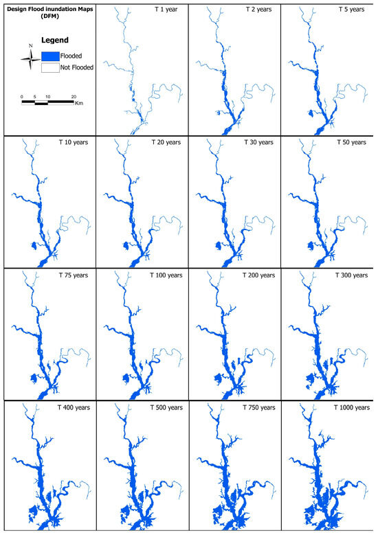To simulate the design flood inundation maps, we use the Lisflood-FP hydrodynamic model, a raster-based two-dimensional flood inundation model [48]. Topographic information and channel geometry, boundary conditions, and friction parameters are required for setting up and running the model. Water depth and water surface elevation are the main outputs of the model. The model is first used to simulate each design flood event utilizing the previously drawn design hydrographs as boundary conditions, assuming all river inflows experience the same flood return period at the same time. From each simulation, a maximum depth map is generated. It is subsequently converted into a maximum flood extent map assuming a grid cell to be flooded if the water depth is larger than 10 cm and dry otherwise. Finally, the generated maximum flood extent maps are recorded as the design flood inundation maps for the considered return periods. This enables us to create an archive of design flood inundation maps (DFMs) associated to the preselected return periods.