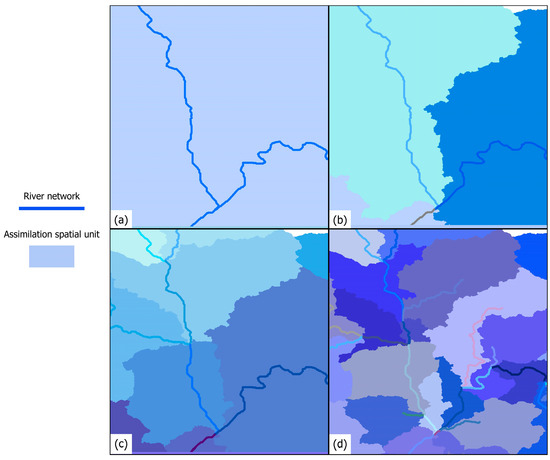 Subdivision of the model domain used for localization of the assimilation filter. (a) Entire domain, (b) 3 sub-catchments, (c) 9 sub-catchments, and (d) 26 sub-catchments. Note: different colors indicate various river network segments and their corresponding sub-catchments.