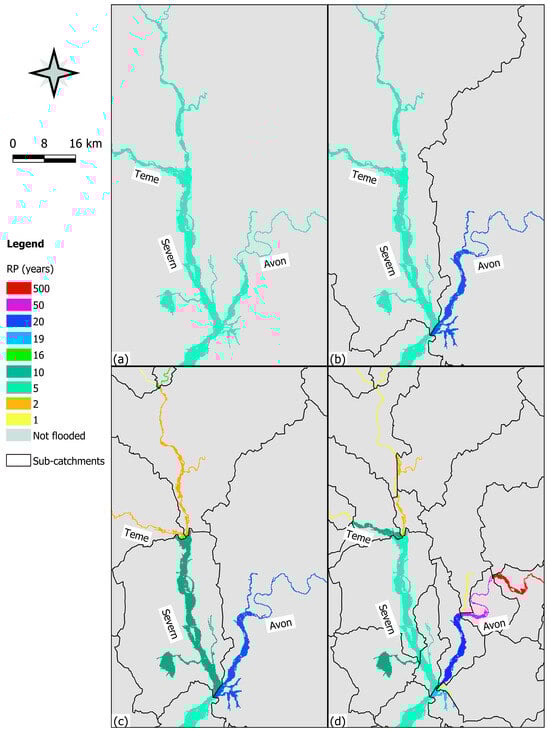 The derived design hydrographs were used as input inflow for all contributing rivers (Severn, Avon, and Teme) and tributaries (Brook Bow, River Stour, River Salwarpe, and River Isbourne) of the hydraulic model at daily time steps. Here, the setup of Lisflood-FP is identical to the one of [32,48]. The model grid cell size is 75 × 75 m and the river channel is represented via the model sub-grid approach [55]. Surveyed cross-sections of the main rivers were used to define channel width and depth and the Manning’s roughness parameter was fixed to 0.0426 in the channel and to 0.06 in the floodplain for the entire domain. A “free” downstream boundary condition to fix the slope of the main channel was set to 0.00007, determined as the overall valley slope.