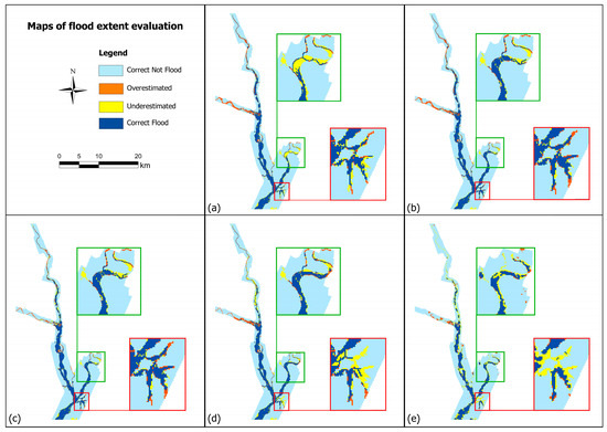 Evaluation of the estimated flood inundation extent for the fifth SAR image (23 July 2007) using the flood extent derived from the aerial photography (24 July 2007). The detail maps correspond to the River Avon (green box) and urban area (red box). (a) No filter localization. (b) Localization over 3 sub-catchments. (c) Localization over 9 sub-catchments. (d) Localization over 26 sub-catchments. (e) Flood map from SAR image.