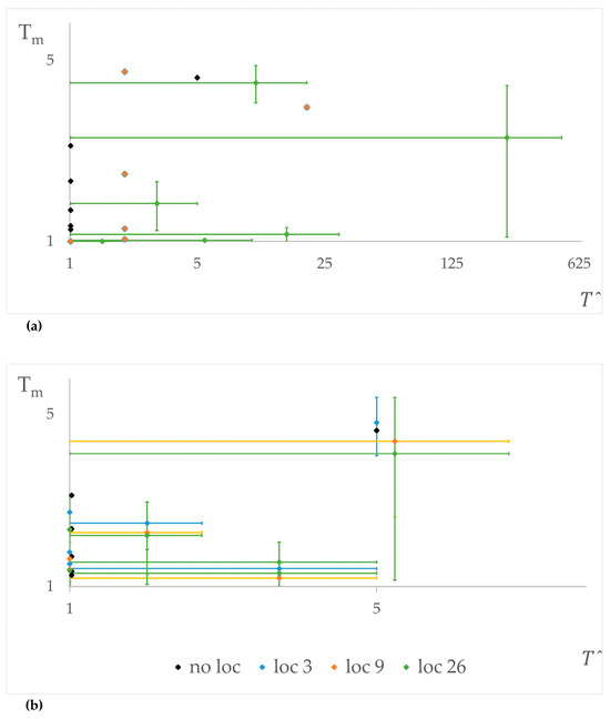 Comparison graphs between ranges of estimated return period () and predicted return period (Tm) along Rivers Avon (a) and Severn (b). Values of /Tm are expressed on logarithmic axes with error bars corresponding to ranges. Different colors indicate different subdivisions of the model domain.