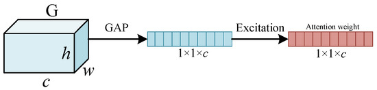 As shown in Figure 2, an SE block comprises two steps: squeeze and excitation, respectively. It is calculated as follows. The input feature map is defined, where h, w, and c represent the height, width, and number of input channels, respectively. Subsequently, a global average pooling operation is conducted on the input feature map to compute the average feature values across each channel, resulting in a scalar value. The global average pooling operator is computed as follows: