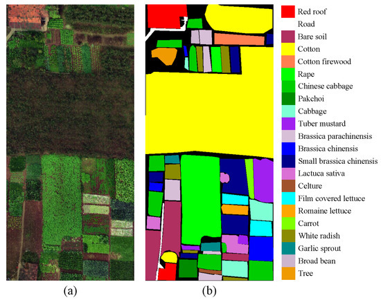 (2) The WHU-Hi-HanChuan (HC) dataset was acquired in Hanchuan, Hubei province, China, with a 17 mm focal length Headwall Nano-Hyperspec imaging sensor equipped on a Leica Aibot X6 UAV V1 platform [63]. The dataset comprises 274 spectral bands spanning from 0.4 to 1 μm. The image spatial dimensions are 1217 × 303 pixels, having a spatial resolution of 0.109 m and encompassing a total of 16 land cover categories. Figure 5 provides the pseudo-color image and ground truth map alongside the names of land cover categories and their corresponding colors.