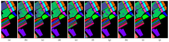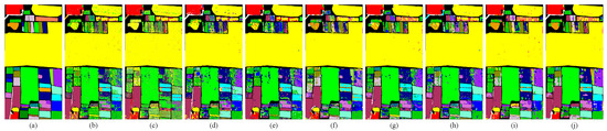 (1) Evaluation Indicators: Four representative quantitative evaluation indicators, including overall accuracy (OA), average accuracy (AA), kappa coefficient (), and accuracy per class, were chosen to evaluate and compare the classification performance of the proposed method with other comparative methods. Higher values for each indicator denote a more precise classification.