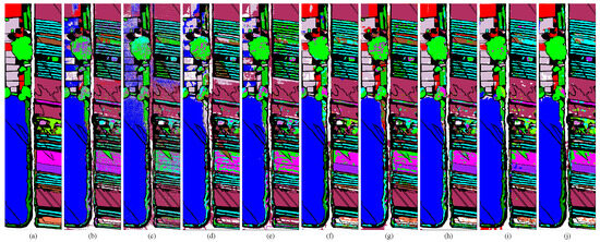 Classification maps of different methods for the HH dataset with 0.1% training samples per class. (a) Ground truth map. (b) SVM [24]. (c) 1-D CNN [43]. (d) 3-D CNN [46]. (e) DFFN [48]. (f) HybridSN [47]. (g) MorghAT [60]. (h) GAHT [55]. (i) SSFTT [54]. (j) MSCF-MAM.