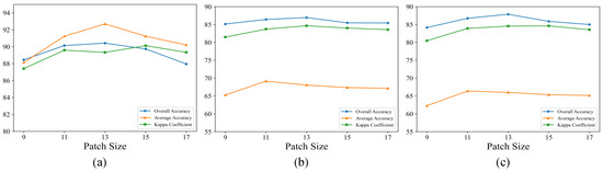 The impact of different patch sizes on OA, AA, and . (a) SV dataset. (b) HC dataset. (c) HH dataset.