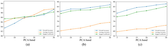 The impact of different PCA bands on OA, AA, and . (a) SV dataset. (b) HC dataset. (c) HH dataset.