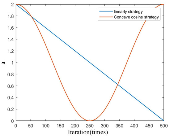 Although GWO has outstanding estimation performance, it also still suffers from the problem of falling into a local optimum for some complex problems. The GWO method is analyzed as a global search for potential prey when A ≥ 1 and a local search when A < 1, where A in the GWO method is determined by the parameter a. Therefore, parameter a is the key to balancing the abilities of global search and local exploitation. While the linearly decreasing strategy, as described in the previous, provides a foundational approach to parameter tuning, it is not the most efficient one. Chiu et al. found that the periodic dynamic tuning strategy had better results [24], and thus we introduced a parameter-tuning strategy based on the periodic variation of the cos function: