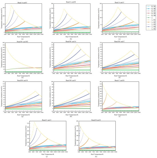 Figure 3a–k illustrates the distribution of temperature estimation errors under varying conditions. These charts were derived from simulations where we varied the emissivity ratios and temperatures of the stars. Each subfigure corresponds to a specific wavelength pair used in the dual-wavelength temperature estimation method. In this experiment, we found that when the emissivity ratio was not equal to one, using the dual-wavelength temperature estimation method introduced certain errors. However, selecting different wavelength pairs could mitigate the impact of emissivity ratio variations on temperature estimation errors. In Figure 3a–d,j–k, it is evident that when the chosen wavelength pairs were closer, variations in the emissivity ratio had a more significant impact on the temperature estimation results. Conversely, in Figure 3e–h, it can be seen that the impact of emissivity ratio variations was relatively smaller.