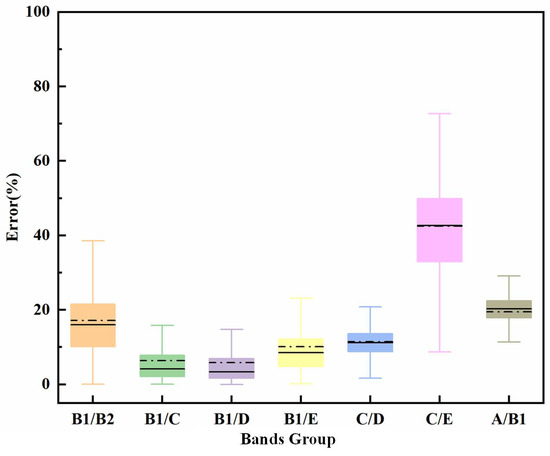 In order to further prove the effectiveness of the dual-band temperature measurement, we selected 351 stars from the MSX catalog with temperatures ranging from 4000 K to 7000 K for temperature estimation. These stars include a range from cooler K-type stars to hotter F-type stars, representing a diverse sample in terms of stellar properties. This selection allows for a comprehensive validation of our temperature estimation methods across different stellar types and conditions. The results of the temperature estimation are shown in Figure 4 and Figure 5. The estimation errors were calculated by comparing our estimated temperatures with the temperatures of the stars investigated in [20]. An analysis of Figure 4 reveals that the combination of band B with other bands, compared with other combinations, achieved the highest estimation accuracy, particularly the combination of B1 with either the C or D bands.
