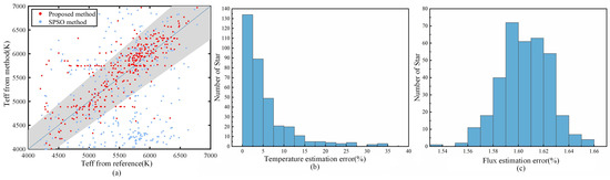 In Figure 5a, the gray area represents an error margin of 10%. It is observable that the majority of the red dots are located within this gray area, outnumbering the blue dots significantly. This indicates that the estimated stellar temperatures using the proposed method predominantly fell within an error margin of less than 10%, demonstrating greater efficacy than the stochastic particle swarm optimization (SPSO) method [20]. Additionally, a statistical analysis of the error results depicted in Figure 5b reveals that 83.5% of the errors were less than 10%, with an average error of 5.82%. The estimation error here, in addition to the error in the dual-band thermometry, also included a systematic error of 3% in the MSX star catalog [27]. Furthermore, compared with the temperature estimation based on the SPSO method, our approach achieved an overall accuracy improvement of 10.8%.
