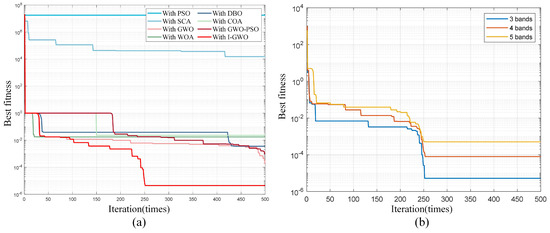 In order to evaluate the effectiveness and stability of the I-GWO method in estimating spectral parameters, it was compared with seven advanced and well-known metaheuristic algorithms: particle swarm optimization (PSO) [28,29], the grey wolf optimizer (GWO) [30], the whale optimization algorithm (WOA) [31], dung beetle optimization (DBO) [32], the sine cosine algorithm (SCA) [33], hybrid GWO-PSO [34], and the Coati optimization algorithm (COA) [35]. In this experiment, to ensure uniform experimental conditions, all of the optimization algorithms used operated within the same decision variable boundaries of the target function. Specifically, the emissivity range was set between 0.9 and 1 [36], and the observation angle varied from to [20]. In order to ensure the fairness and comparability of the experiments, the initial population size for all algorithms was uniformly set to 30, and the maximum number of iterations was fixed at 500. Additionally, to minimize the impact of randomness on the experimental outcomes, each algorithm underwent 100 repeated estimations. Subsequently, the average best fitness values and standard deviations (STDs) of these estimations were calculated.