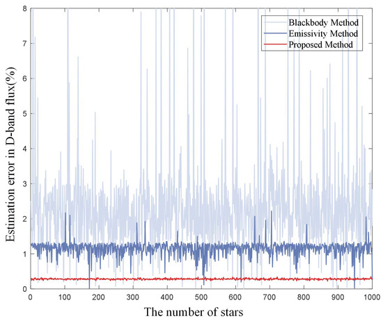 In order to prove the validity and stability of the proposed method, the proposed method was compared with two mainstream catalog-based methods: the method based on blackbody estimation (Blackbody Method) [17] and the method considering emissivity (Emissivity Method) [20]. In this experiment, 1000 stars in the MSX catalog were randomly selected as experimental objects, and the A, B1, and C bands were used as inputs to estimate the flux of these stars in band D.