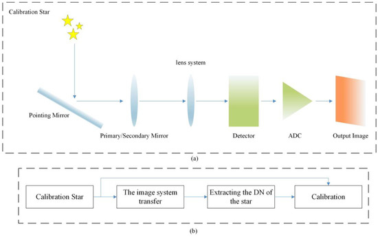 The star calibration process primarily utilizes stars as reference sources to perform absolute radiative calibration across the entire optical path for large-aperture cameras. As illustrated in Figure 8a, stellar radiation enters and passes through the optical system before reaching the detector’s imaging system for imaging. Figure 8b depicts the process of star calibration, with the radiative calibration formula expressed as follows: