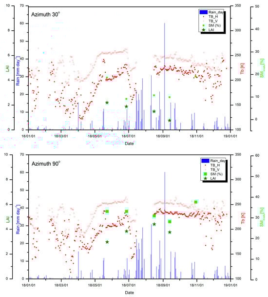 The brightness temperatures registered using ELBARA in 2018 included 6992, 6232, 6956, and 6204 total measurements for the specific azimuths 30°, 90°, 180°, and 320°, respectively. Since four measurements were realised per day for each azimuth, for the further data evaluation, the data were arranged in a daily manner using mean values as the results. ELBARA retrievals for two polarisations, and for four analysed azimuths together with daily precipitation, and soil moisture together with Leaf Area Index (LAI) assessed during the measuring campaigns are shown in Figure 3. In 2018, there were two significant data gaps in the periods 21 January 2018–6 February 2018 and 16 July 2018–15 August 2018, both as a result of maintaining works.