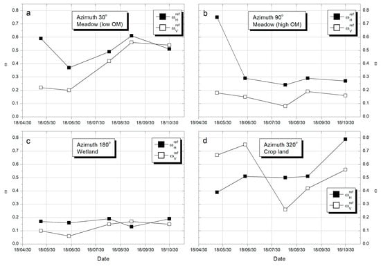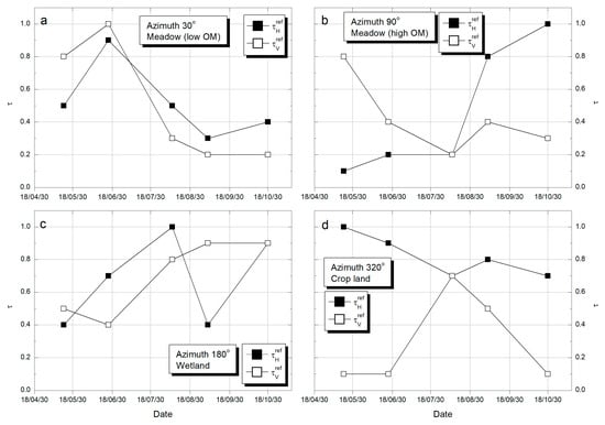 The values of τ reported in the literature vary generally in the range 0–0.6 for cropland and grassland [,], reaching values of 0.9 for forest []. In the present study, the maximum variation of optical depth depending on the period of the year was obtained for the meadows, where the difference between the maximum and minimum values reached 0.9 (azimuth 90°, H polarisation). The mean annual values of τ were in the range from 0.30 to 0.80 for the cropland, from 0.40 to 0.52 for the meadows (including the two investigated meadows), and from 0.60 to 0.70 for the wetland. Taking into account that the results include two polarisations, the obtained values are in good agreement with the global scale results.