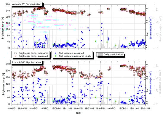 Soil moisture calculated (blue stars) from retrievals registered using ELBARA (black circles) at azimuth 30° at polarisation H (lower graph) and V (upper graphs) in 2018–2019 combined with simulated values of brightness temperatures (red dots) calculated using reference coefficients and values of the soil moisture measured in situ (green squares). The precipitation registered by the agrometeorological station is shown (grey bars).