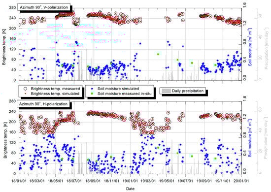 Soil moisture calculated (blue stars) from retrievals registered using ELBARA (black circles) at azimuth 90° at polarisation H (lower graph) and V (upper graphs) in 2018–2019 combined with simulated values of brightness temperatures (red dots) calculated using reference coefficients and values of the soil moisture measured in situ (green squares). The precipitation registered by the agrometeorological station is shown (grey bars).