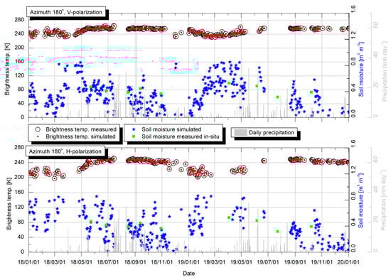 Soil moisture calculated (blue stars) from retrievals registered using ELBARA (black circles) at azimuth 180° at polarisation H (lower graph) and V (upper graphs) in 2018–2019 combined with simulated values of brightness temperatures (red dots) calculated using reference coefficients and values of the soil moisture measured in situ (green squares). The precipitation registered by the agrometeorological station is shown (grey bars).