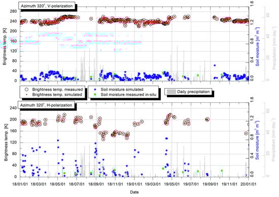Soil moisture calculated (blue stars) from retrievals registered using ELBARA (black circles) at azimuth 320° at polarisation H (lower graph) and V (upper graphs) in 2018–2019 combined with simulated values of brightness temperatures (red dots) calculated using reference coefficients and values of the soil moisture measured in situ (green squares). The precipitation registered by the agrometeorological station is shown (grey bars).