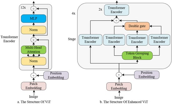 Our objective is to enhance the feature extraction capability for small targets while preserving the global receptive field of ViT, thus prompting the design of a twin network structure. As depicted in Figure 2a, within the conventional ViT model, the encoder repetitively stacks the transformer block 12 times. In the EViT model, these 12 concatenated transformer blocks are segmented into 4 stages, with a local attention calculation branch, predicated on feature similarity, appended to the first block of each stage. The changed transformer block is named a twinned transformer block, which uses a twin network structure and is based on the transformer block.
