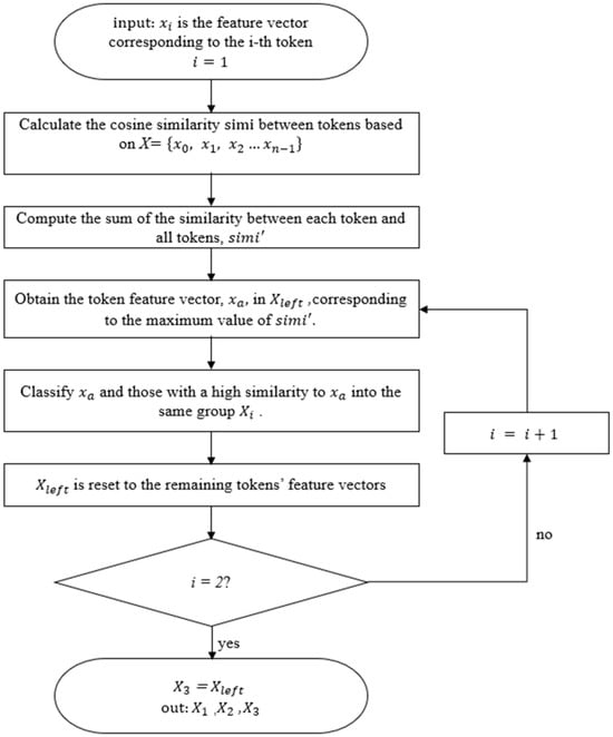 The function max_x in Equation (9) is used to obtain the corresponding feature vector in , which maximizes the value of . Note that when sorting the first group, is simply X. After obtaining , grouping can be performed based on the threshold set by the similarity between and in . During the experiment, the average of similarity between and is used as the threshold.