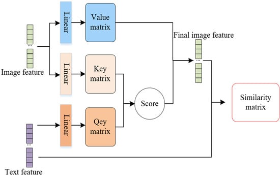This layer implements the cross-attention approach introduced in Reference [], using text features to consolidate attention for regional image features. Initially, the relevant weights between each region and the text are established; subsequently, the weighted sum of these weights is computed to derive the overall feature of the image. Next, the image–text similarity matrix is computed as the output. The detailed architecture is depicted in Figure 5.