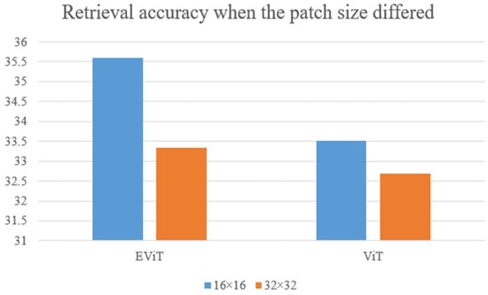 Conclusion: Figure 6 demonstrates that when the patch size was 16 × 16, the retrieval accuracy was notably higher compared to 32 × 32, and the improvement over ViT was more significant. When the patch size was 16 × 16, the absolute return of EViT increased by 2.08% and the relative return increased by 6.2% compared with ViT. When the patch size was 32 × 32, the absolute return of EViT increased by 0.64% and the relative return increased by 2% compared with ViT. This outcome can be attributed to two primary reasons. Firstly, a smaller patch size results in more patches and finer image segmentation, thereby retaining more image features. Secondly, with an increased number of patches, irrelevant patches have a greater impact. The classified local self-attention calculation method is conducive to eliminating the impact of unrelated patches.