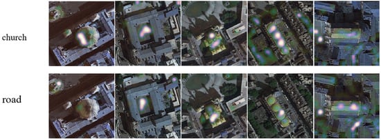 The above results may have been caused by the fact that the church and the road usually appear at the same time in remote sensing images of the church type in the dataset, so the recognition effect of the model for the road is relatively poor. Figure 9 shows heat maps of some random images of the church in the RSITMD dataset. It can be seen that there are roads beside the church in all the images displayed. In these images, the model basically does not recognize the road. Therefore, “The church is near the road” is not a good description to distinguish church-type images. In other words, this sentence is not fine enough to support the model’s distinction between such features. This also limits further improvement of the model’s accuracy. In addition, both methods focus on the semi-circular gray area when the keyword is road. This part of the area is relatively flat and has characteristics similar to those of the road. It may have caused a miscalculation.