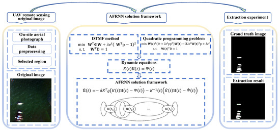 This paper proposes a dynamic tracking matched filter (DTMF) scheme for the extraction of ships from UAV remote sensing images. DTMF incorporates a dynamic penalty term based on the MF and combines the dynamic adjustments of the regularization parameter and the time variable to strengthen the orientation towards satisfying the constraints. Furthermore, the time variable is introduced as a reconciliation factor, whereby the regularization parameter grows exponentially with time, adapting to the dynamic changes in the system. This ensures that the algorithm accurately tracks the target spectral vectors over time, and is able to have good adaptability and sustained detection performance at different time points. Subsequently, DTMF is integrated into the RNN solution framework through a rigorous mathematical derivation. In order to enhance the resilience and precision of the detection scheme, a novel nonlinear activation function is introduced and an AFRNN model that can be dynamically calibrated to adapt to fluctuations in the input data or environmental conditions is proposed. This model eliminates the time lag problem and facilitates rapid convergence. In addition, a systematic theoretical analysis and corresponding results of the AFRNN model are presented to investigate and ensure its convergence and robustness. The technical route of this paper is shown in Figure 1.