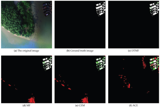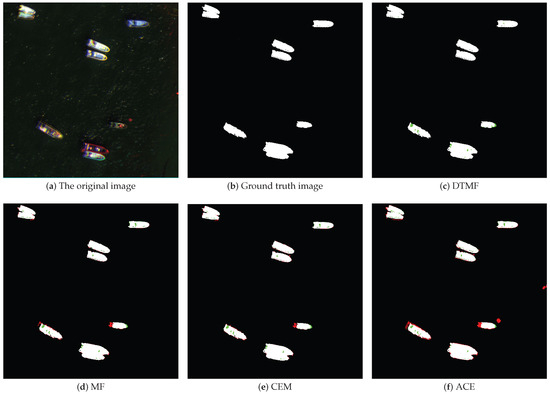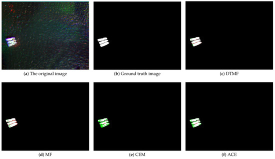 Figure 9a depicts sample region 6, which exhibits a more complex background that may impede the ship extraction process to some extent. The ships were situated in close proximity to the jetty, and the boundaries between them were not entirely clear. Additionally, the complex rust and mottled colors on the hulls of ships can create challenges in spectral differentiation. The containers or cargo on the quayside may also be spectrally similar to ships, further complicating the extraction process. The hulls of different ships also exhibit different spectral characteristics. The simultaneous existence of spectra that are different for the same object and objects that are different for the same spectrum makes the extraction task more challenging. In Figure 9c–f, the results of the different detection methods are presented. The DTMF method is capable of overcoming the issue of homogeneous and heterogeneous spectra by suppressing the same interfering background as the hull spectra. Furthermore, all the hulls with different spectra are extracted. The DTMF method is the closest to the real situation on the ground, while the other methods show multiple missed or false detections, with the CEM and ACE methods in particular having a high number of false alarms.