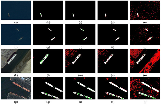 As illustrated in Figure 8a, sample region 5 exhibits a luxuriant growth of trees, which exudes a verdant hue. The low color contrast between the boat color and the surrounding seawater and forest may present a challenge for the threshold-based segmentation method. Additionally, the reflected light from the water surface may influence the pixel values in the image, thereby increasing the difficulty in distinguishing the boat from the reflective water surface. As illustrated in Figure 8c–f, the DTMF method is the most effective of the four in terms of extraction results, with no instances of misdetection of the ship contours. However, the DTMF method does exhibit misdetection of the ship contours. The remaining three methods mis-extract the shoals and water bodies as ship hulls.