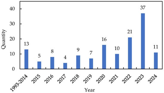 Currently, the field of ecological restoration research based on remote sensing technology exhibits an active research posture. For example, the data shown in Figure 1 illustrate the number of publications on ecological restoration using remote sensing in recent years, reflecting significant growth and an ongoing development trend in this area (including only a portion of the publications from 2024). The graph indicates that although there are fluctuations in the annual number of publications, there is an overall upward trend, particularly notable in the number of publications from 2023. This growth trend demonstrates the increasingly widespread application of remote sensing technology in ecological restoration.