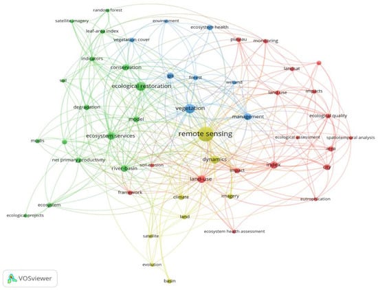 Figure 2 displays a keyword association network diagram created using VOSviewer1.6.20 software, where keywords are divided into four main categories: a yellow area centered around “remote sensing”, a green area centered around “ecological restoration”, a red area centered around “index”, and a blue area centered around “vegetation.” The classification of these keywords reveals various research directions and focal points. The hot topics in remote sensing monitoring for ecological restoration include different categories of ecological restoration such as forests, soil, river basins, and climate; systemic keywords like ecological assessment, ecosystem services, indexes, and indicators; and remote sensing monitoring aspects such as MODIS, Landsat, imagery, and monitoring.