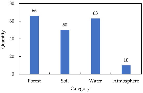 Following a detailed review of the literature retrieved, we primarily examined the titles, keywords, abstracts, research areas, and content of the documents and organized the related indices. We tabulated the number of publications related to the ecological restoration of forests, soil, water bodies, and the atmosphere, as shown in Figure 3. It is important to note that a single publication could cover different geographical areas and multiple types of ecological restoration. The results show that the number of publications related to forests, soil, and water bodies is higher, mainly due to the high level of attention these areas receive, the convenience of data acquisition, and the strong demand for practical applications. Although the number of publications involving atmospheric ecological restoration is relatively fewer, in the context of climate change and air pollution, research on atmospheric ecological restoration is also critically important and warrants increased focus and further investigation.