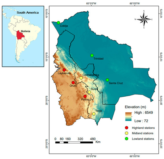 Location map of Bolivia showing the rainfall gauging stations used for this study. The background provides elevation information extracted from ALOS PALSAR (Phased Array L-band Synthetic Aperture Radar on the Advanced Land Observing Satellite).