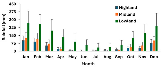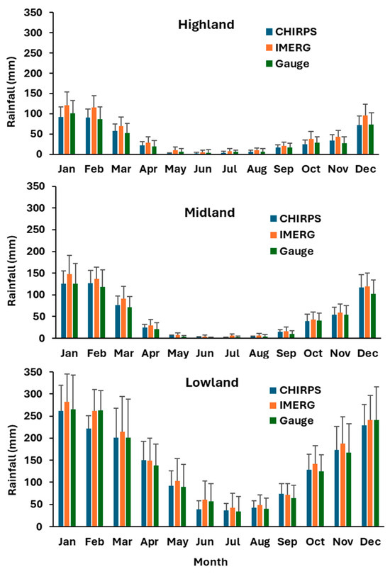 Monthly mean gauge-based rainfall (2002–2020) averaged for the Highland, Midland, and Lowland stations. Vertical bars represent standard deviation monthly rainfall.