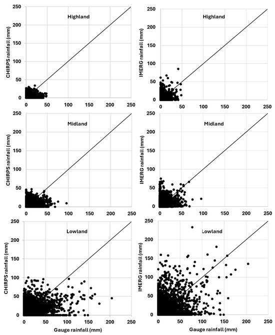 The analysis considering the three distinct geographical zones showed varying degrees of performance between the IMERG and CHIRPS rainfall products. Specifically, in terms of rainfall detection skill, the IMERG product exhibited superior performance, with detection rates of 60% in the Highland, 57% in the Midland, and 58% in the Lowland regions (Table 5). Conversely, the CHIRPS product demonstrated lower detection rates, with 46% in the Highland, 45% in the Midland, and 45% in the Lowland regions. When it comes to detecting non-rain events, the CHIRPS rainfall product outperformed the IMERG product across all three zones. Notably, CHIRPS captured a substantial portion of total rainfall, with 90% and 92% accuracy in the Highland and Midland regions, respectively. In contrast, there was a notable underestimation of 32% in the Lowland region for the CHIRPS rainfall product. On the contrary, the IMERG product tended towards overestimation, revealing 56% and 43% overestimations of total rainfall in the Highland and Midland regions, respectively, but displayed better accuracy with only an 8% overestimation in the Lowland region.