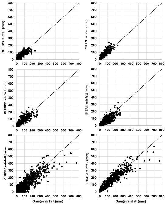 Moreover, to assess whether temporal aggregation improves the performance of both satellite rainfall datasets, continuous statistical validation has been carried out considering a monthly timescale (Table 7). The CHIRPS rainfall product exhibits superior performance, indicated by (low ME), across all three regions when compared to the IMERG product. The IMERG rainfall product at Cobija station in the Lowland region shows a better ME (−2.40 mm) than other stations and CHIRPS data within the same region (Table 7). The MAE at monthly timescale revealed that the rainfall data from the CHIRPS product perform better than IMERG with relatively good agreement with the observed rainfall. Moreover, bias index metrics revealed that the CHIRPS rainfall product performs better in the Highland and Midland regions, whereas the IMERG product performs better in the Lowland region. Monthly SREs and gauge data were also compared visually using scatter plots of monthly rainfall over the Highland, Midland, and Lowland stations (Figure 4). The monthly comparison (Figure 4) shows that the degree of scatter of points markedly reduced compared to the daily comparisons (Figure 3), indicating that the performances of the SREs improved when rainfall estimates were evaluated at a monthly timescale compared with evaluations at a daily timescale. The improvement in the performance of SREs at monthly timescales was also evidenced by high index of agreement values at monthly (Table 7) compared to daily (Table 6) evaluations.