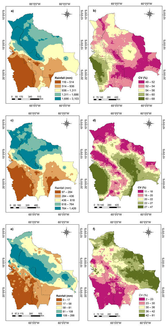 Since the SREs evaluation results revealed that CHIRPS has a better performance in comparison to IMERG across different terrains of Bolivia, we assessed the spatio-temporal rainfall pattern considering long-term (1981–2020) rainfall data from CHIRPS. The mean annual rainfall ranges from 116 mm to 3103 mm (Figure 6a). The area with the highest rainfall amounts is the Lowland region followed by the Midland while the Highland region receives the least amount of rainfall. About 20% of Bolivia receives a mean annual rainfall between 116 mm and 514 mm, mainly located in the southern parts (60% of the Highland region). The quantile map of mean annual rainfall (Figure 6a) also shows relatively high amounts of rainfall (1686–3103 mm) in the northern parts of Bolivia, covering 40% of the country. Large parts of the Midland region receive a moderate amount of annual rainfall (514–936 mm), with higher values (1686 to 3103 mm) observed in the northeast part (Figure 6a). The CV values of annual rainfall (Figure 6b) were relatively high (>50%) for the southwestern part, while large swaths of Bolivia showed CV values below 50%, indicating the less inter-annual variability of rainfall. The spatial patterns of the main wet season (from December to February) rainfall resemble that of the mean annual rainfall except for the decrease in rainfall values (Figure 6c). During the wet season, about 20% of Bolivia receives seasonal rainfall of more than 764 mm, mainly located in the northern Lowland region, whereas the wet season rainfall over large parts of southern Bolivia is below 436 mm (Figure 6c). The CV for the wet season rainfall (Figure 6d) shows CV values less than 50% indicating less inter-seasonal rainfall variability. Overall, areas with less wet season rainfall have high CV values. During the dry season (from June to August), the western part of the Lowland region presents the highest rainfall values, between 108 and 588 mm (Figure 6e). The CV of dry season rainfall revealed that high variability was observed in large parts of the Lowland region compared to the Midland and Highland regions (Figure 6f).