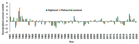 Figure 7 shows the standardized annual rainfall for each of the three regions. During the period 1981–2020, both negative and positive anomalies of rainfall were observed, indicating the occurrence of wet/normal and dry years. The interannual variability of each region has different trends; strong positive anomalies (years of high rainfall, representing wet/normal years) were observed in 1984 and 2018, especially in the Midland and Highland regions. A long dry period was observed from 1992 to 2000, with the years 1994 and 1995 being the ones with high negative anomalies (dry years). Strong negative anomalies (years of low rainfall/dry years) were also observed in the years 2004 and 2016 (Figure 7). The drought years (1994/1995 and 2015/2016) and the wet/normal year (2017/2018) were selected for further assessment of drought occurrence in Bolivia.
