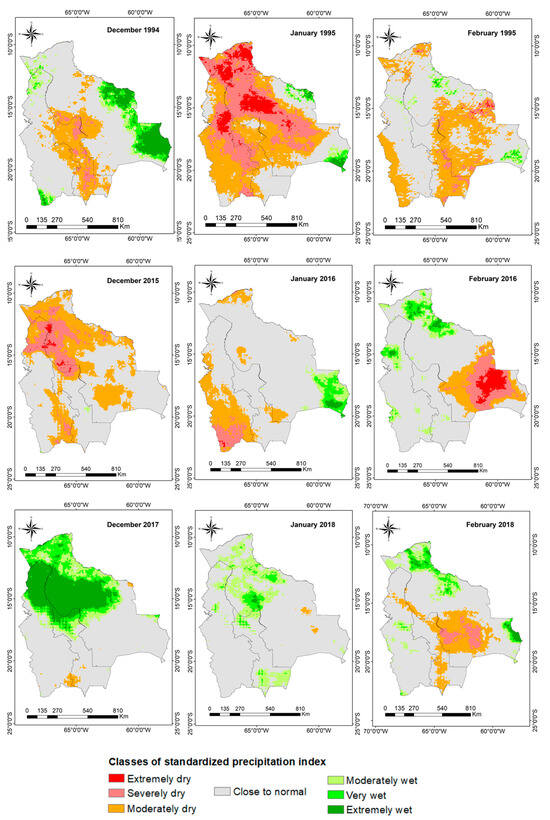 In this study, we used the Standardized Precipitation Index (SPI) to assess the occurrence of meteorological drought in Bolivia. The SPI, proposed by [42], has gained widespread use due to its strong theoretical foundation, robustness, and versatility in drought analysis. SPI’s primary advantage is its ability to analyze drought impacts across various temporal scales, allowing for the identification of different drought types [43]. Following the identification of dry and wet/normal years through the analysis of standardized annual rainfall, we investigated meteorological drought occurrence for selected months of the main rainy season (December, January, and February) and selected dry and wet/normal years using SPI. The SPI was computed using long-term (1981–2020) CHIRPS data to demonstrate its utility for drought assessment in data-sparse regions. The steps employed to calculate the SPI were: (i) calculate monthly mean (μ) and standard deviation (σ) of rainfall for the target months; (ii) compute SPI for the target year and months as SPI = (X − µ)/σ, where X is the monthly rainfall of a particular year of interest, μ is the mean rainfall for that month over the period of assessment (1981–2020), and σ is the standard deviation of rainfall for that month over the period of assessment (1981–2020); and (iii) classify and interpret the SPI values into drought categories as: SPI ≥ 2: Extremely wet, 1.5 ≤ SPI < 2: Very wet, 1 ≤ SPI < 1.5: Moderately wet, −1 < SPI < 1: Near normal, −1.5 ≤ SPI < −1: Moderately dry, −2 ≤ SPI < −1.5: Severely dry, and SPI < −2: Extremely dry.