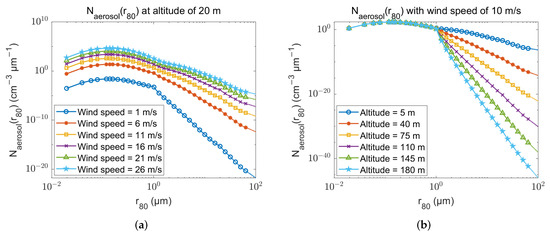 As suggested above, the SSA particle size distribution model on sunny days was based on the ANAM and the range of in simulations was set from 0.01 to 100 m [28,29,55]. According to Section 2, was mainly determined by the sea surface wind and the altitude from the sea surface. The influence of the two parameters on is depicted in Figure 1. Obviously, particles of all sizes fluctuated with changes in wind speed, but only particles larger than 1 m were sensitive to a change in altitude. What is more, larger particles showed a higher sensitivity to changes in altitude. The threshold of 1 m may not fully represent reality, but it should provide a reasonable approximation for the simulation of the aerosol particle size distribution given the extensive data analysis of the ANAM. Additionally, both Lewis et al. and Kaloshin et al. also mentioned that the influence of gravity and the vertical concentration gradient on SSA particles smaller than 1 m were negligible [23,28].