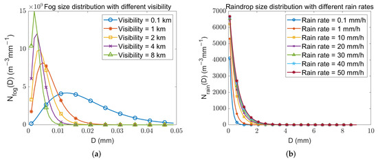Based on the models in Section 2, the relationship between / and visibility/rain rate was simulated, as shown in Figure 3. By comparing the two subgraphs, it can be seen that the size of the fog droplets was mainly concentrated within 0.02 mm, two orders of magnitude smaller than the main size of raindrops. The other way around, the concentration of fog droplets was much higher than that of raindrops. The two differences determined the distinct electromagnetic characteristics of fog and rain, as shown in Figure 4.