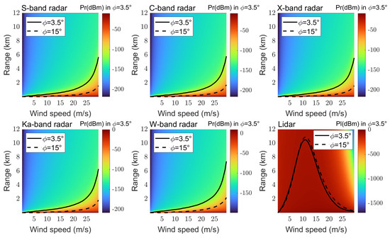 With and of SSA, the echo power was calculated across a range of elevation angles and wind speeds based on instrument parameters concluded in Table 1. Elevation angles were considered here because the altitude, relative to , varied with detection ranges and elevation angles. Figure 5 illustrates the impact of elevation angles and wind speeds on the performances of the lidar and radars. indicates the critical point where the echo power was equal to the receiver sensitivity and the velocity variance of the Doppler system met the requirements, as drawn with black curves, where the solid and dashed curves are for and , respectively.