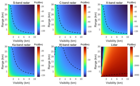 By combining the instrument parameters and the electromagnetic characteristics of scattering media under varying intensities of fog and rainfall conditions, the echo power and corresponding of the radars and lidar were calculated, as depicted in Figure 6 and Figure 7.