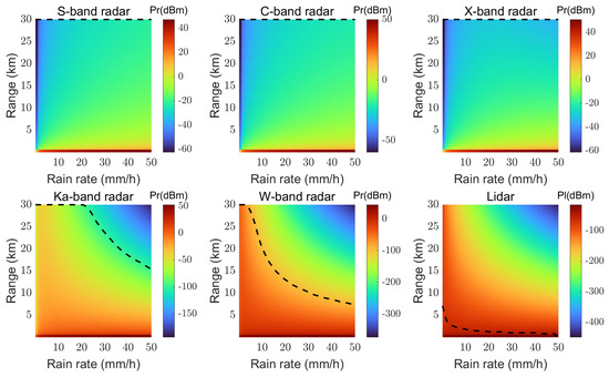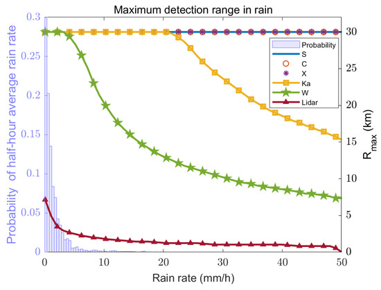 Figure 7 presents the simulation results in the rain cases. In fact, of the S/C/X-band radars exceeded 30 km, but 30 km was set as an upper limit here because a detection distance of 30 km already satisfies most requirements. Obviously, for the S-, C-, and X-band radars, signal attenuation in the rain was too minor to impact the detectable range. For the Ka- and W-band radars, decreased by up to 50% and 75%, respectively, when the rain rate increased to 50 mm/h, but their detectable ranges were more than 5 km, even under heavy rain conditions. In comparison, the lidar performed much worse, with the limited to only about 1–2 km. For rain cases, we could conclude the following: