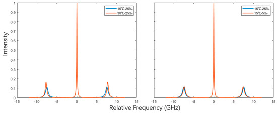 Moreover, to obtain the complete Rayleigh–Brillouin spectrum, three Lorentzian models were used to fit the central free-spectrum range. It can be seen that after certain calibration, good fitting results can be achieved with the three Lorentzian linear models. The Brillouin frequency shift was obtained by extracting the center positions of the Lorentzian linear models obtained from fitting on both sides and taking the arithmetic average. The Brillouin linewidth can be obtained by extracting the FWHM of the Lorentzian linear models, as shown in Figure 12.