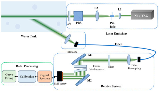 In Figure 3, the laser source produces a narrowed single-frequency light. The light was then passed through a beam expander with a pinhole that provides 2× magnification and then directly placed into a sealed stationary water tank after applying an optical isolator (comprising a PBS and quarter-wave plate). The echo scattering light was captured by the receiving telescope with aperture diameter = 25.4 mm and focal length = 75 mm. The photographs received by the telescope were transmitted by an optical fiber with a numerical aperture = 0.22. The photons were then collimated by a fiber decoupler with aperture diameter = 50.8 mm and focal length = 100 mm. After collimation, beam expansion, and filtering, the backscattered light spectrum was transmitted to the Fizeau interferometer for frequency selection and then sampled by a PMT array. The obtained photocurrent signal was subjected to channel differential correction and removal of random noise and dark noise, followed by determination of the pixel resolution. Finally, curve fitting was performed to extract the desired Brillouin frequency shifts and linewidths. For the detailed system parameters, refer to Table 1.