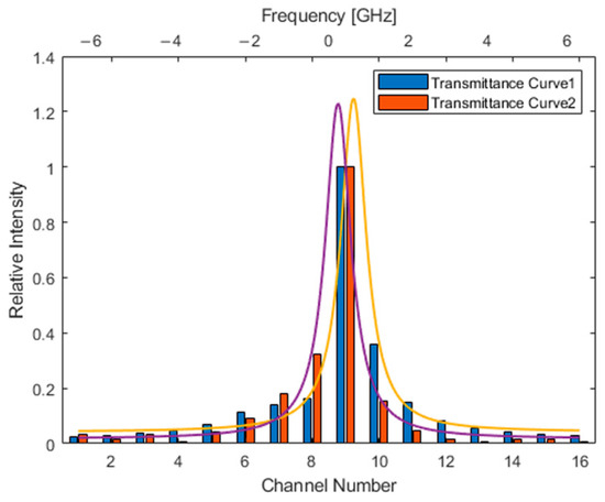 After obtaining the smoothed average signal, the pixel resolution for each channel was determined. This was achieved by illuminating the PMT cathode with an attenuated reference laser signal, which allowed the acquisition of the 16-channel distribution of the interferometer instrument function. By altering the laser frequency, the positions of the interference fringes on the PMT channel exhibited a linear variation. Figure 5 shows that typical interference fringes move when the laser frequency changes.